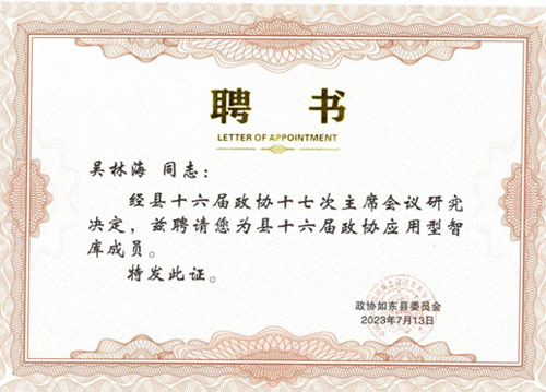 我所主任會計師吳林海同志被政協(xié)如東縣委員會2023713聘為縣十六屆政協(xié)應(yīng)用型智庫成員。