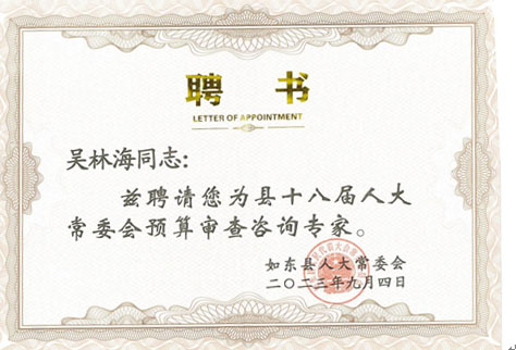 被聘為如東縣人大常委會202394聘為縣十八屆人大常委會預(yù)算審查咨詢專家。